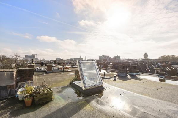 Via de genoemde trap bereik je het dak. Hier bestaat de mogelijkheid om – na vergunning en toestemming – een dakterras te realiseren. Een heerlijke plek om in de zon te zitten met uitzicht over de stad.