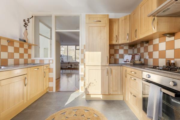 Entree/hal met meterkast, toilet en trapkast. De L-vormige woon- en eetkamer vormt het hart van de woning en profiteert van een prettige lichtinval en heeft een deur naar de achtertuin. Halfopen keuken voorzien van diverse inbouwapparatuur, waaronder een gaskookplaat, afzuigkap, oven, koel-vriescombinatie en vaatwasser. Aansluitend een praktische bijkeuken annex berging.