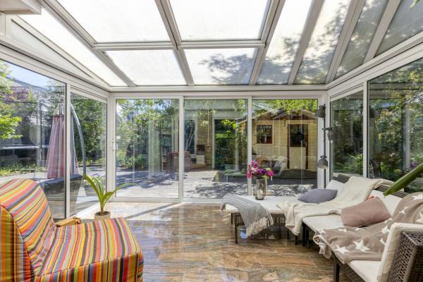 Aangebouwde serre met schuifdak en veel lichtinval;