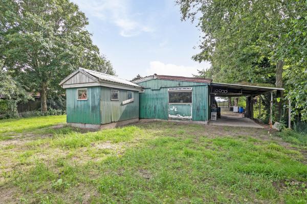 Vrijstaande houten garage, berging en overkapping;