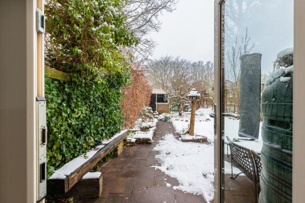 De diepe en verzorgde tuin op het zuiden is een heerlijke plek om te genieten van het buitenleven. Dankzij de diverse planten, struiken en bomen is er volop groen en privacy. Er is altijd een plekje in de zon, maar ook aan schaduw is gedacht. Achterin de tuin staat een praktische berging voor fietsen en (tuin)gereedschap. Achter de woning ligt een leuke speeltuin voor de kinderen.