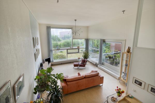 Een royale, lichte woonkamer van ca. 38 m² met indrukwekkende plafonds en grote raampartijen. Via de schuifpui stap je zo het zonnige dakterras op – een perfecte plek om te genieten van de middag- en avondzon.