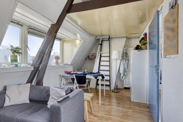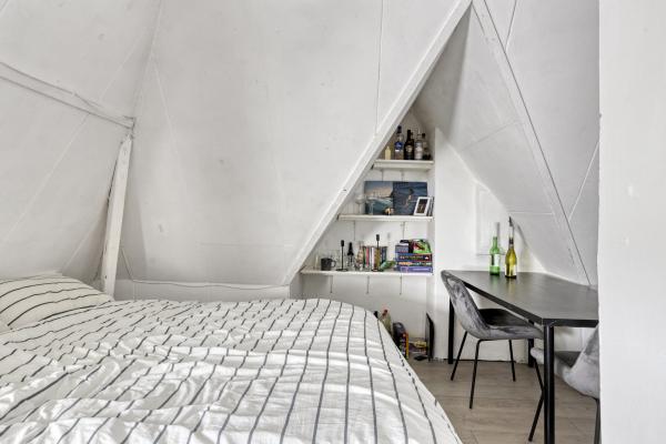 Overloop met berging. Twee ruime kamers (ca. 18 m² en 15 m²), waarvan één beschikt over een eigen keukenblok. de andere met wastafel/koelkast – ideaal voor een stel of twee vrienden die nét iets meer privacy willen.