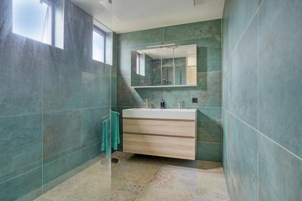 Overloop met tweede toilet en deur met toegang naar het groene dak; twee ruime slaapkamers (ca. 14 m² en ca. 11 m²); moderne badkamer met inloopdouche en dubbele wastafel.