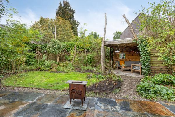 De groene, zonnige achtertuin op het westen biedt volop privacy en is fraai aangelegd met leistenen natuurtegels, een gezellig terras en een overkapping — perfect om tot laat in de avond buiten te zitten.