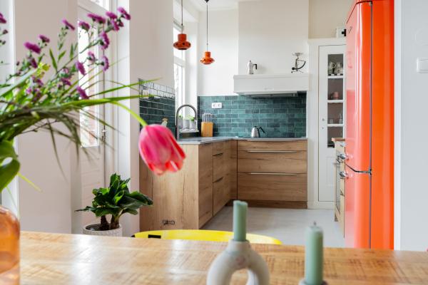 Moderne woonkeuken met suitedeuren en toegang tot balkon;