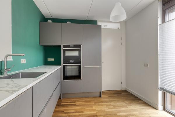 Bij binnenkomst tref je een nette hal met bergruimte en de moderne, open woonkeuken – een echte eyecatcher. De keuken is voorzien van hoogwaardige inbouwapparatuur (Neff): een inductiekookplaat, afzuigkap, combi-oven, stoomoven, koelkast en vaatwasser. Er is volop ruimte voor een gezellige eettafel met uitzicht op het zonnige terras.