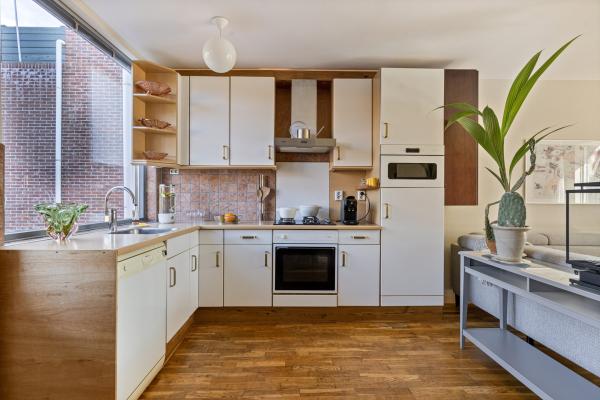 Entree, hal met toilet en meterkast; lichte woonkamer met open keuken en eethoek. De keuken is uitgerust met diverse inbouwapparatuur, waaronder een gaskookplaat, oven, magnetron, koelkast, afzuigkap en (vrijstaande) vaatwasser. Via openslaande deuren bereik je het balkon dat leidt naar de tuin.