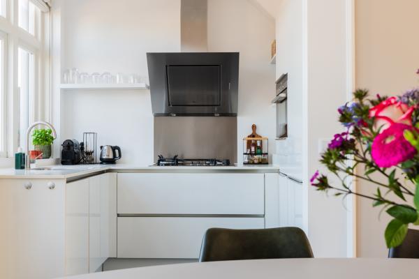 Entree, hal met modern toilet. De woonkamer is ruim en licht, voorzien van een houten vloer, erker en houtkachel. Aan zowel de voor- als achterzijde is een balkon aanwezig (zuid en noord), wat zorgt voor veel lichtinval en altijd een fijn plekje om buiten te zitten. De halfopen keuken heeft een moderne, lichte uitvoering en is dankzij onder andere een gaskookplaat, afzuigkap, combi-oven, koel-vriescombinatie en vaatwasser van alle gemakken voorzien.