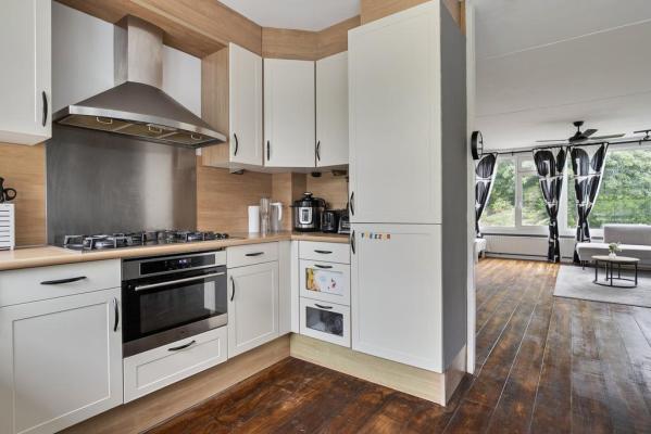 Zonnige woonkamer met open keuken (ca. 46 m²) met diverse apparatuur.