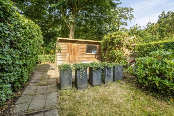 Zonnig tuin op het westen met houten tuinberging;
